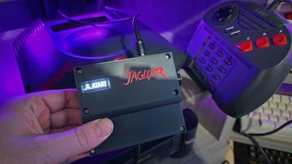 The cartridge has a DC power jack on the top which is powered from a USB cable. This provides the power to the Raspberry Pi as I didn’t want to risk drawing too much current from the Jaguar itself. The rotary encoder on the side of the unit is used to scroll through the game list and select which game you want and what bank to flash the game to.