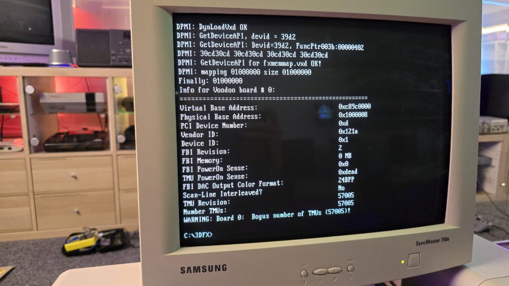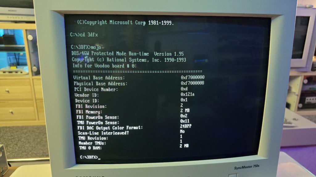 The next step was to test it out and see what state it was in. And things were not looking good. I ran the 3DFX diagnostic utility mojo.exe from DOS, and it just hung the system straight after DOS4GW.exe was loaded.